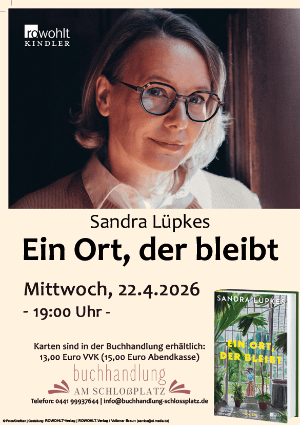 Am 22. April dürfen wir Sandra Lüpkes, nur wenige Tage nach Veröffentlichung ihres neuen Romans, in unserer Buchhandlung willkommen heißen. Sie liest aus ihrem neuen Buch „Ein Ort, der bleibt“, das am 17. April im Rohwolt Kindler Verlag erscheinen wird.